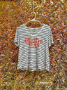 This is a pre-owned garment we purchased at a thrift store, laundered, then had screen printed by a local small business. If you want any more details on it, just shoot us a message!