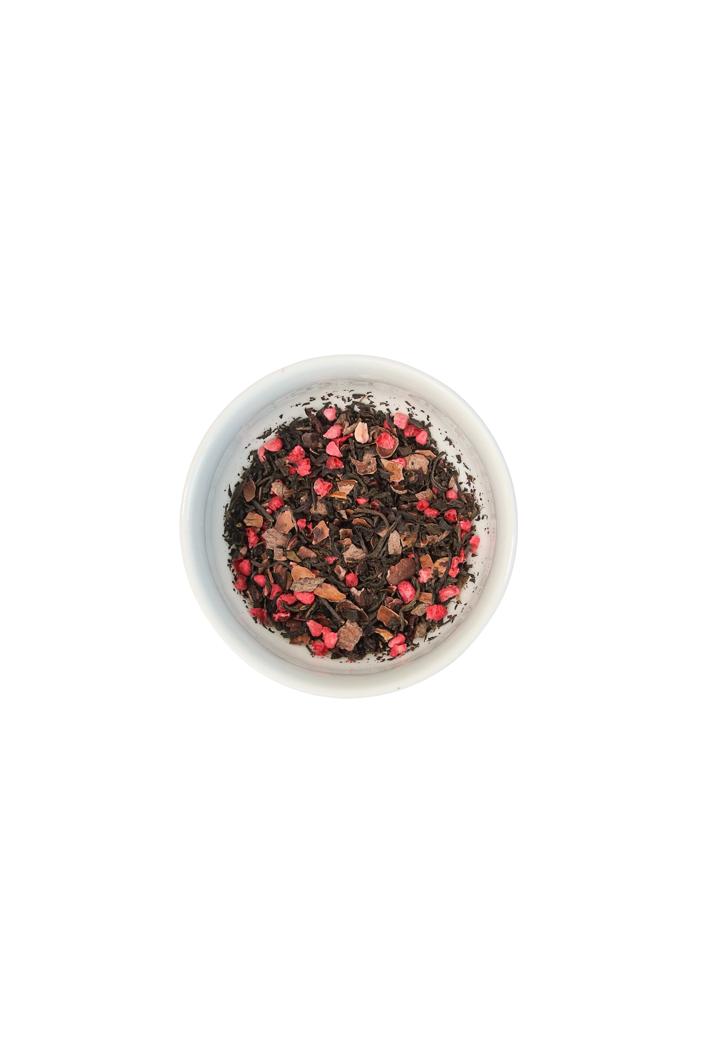 Ingredients: Black tea, cacao nibs, vanilla black tea (black tea, vanilla bean, natural and artificial flavors), cacao shells, raspberry, hibiscus.